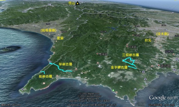 根據今年"國立中央大學太空遙測研究中心"所出版的『古徑‧越徑』衛星影像月曆所示,先民在"淡水廳(台北)"與"葛瑪蘭廳(宜蘭)"之間用腳走出了許多錯綜複雜的路徑,如今只剩下『三貂嶺古道』、『草嶺古道』、『巃嶺古道』未被鐵公路取代且保留較為完整: